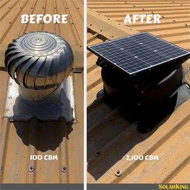 In the hot Australian summer the SolarKing Exhaust Fan extracts the dry and hot air in the roof. 20x more air than a wind driven Whirly Bird and can reduce roof temperatures by up to 30°.